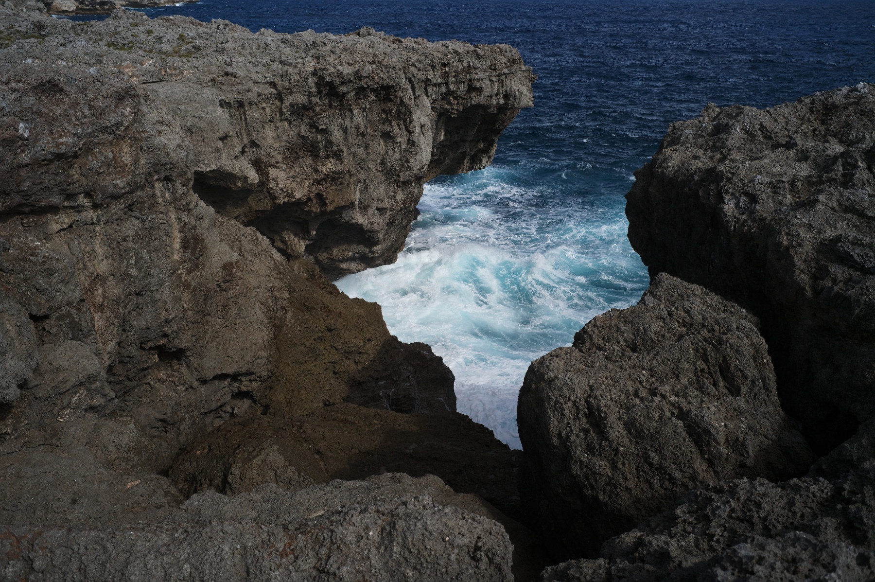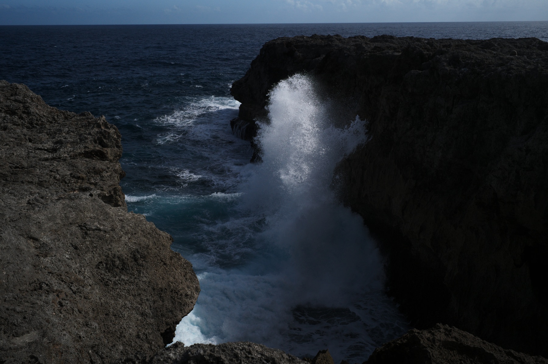 崖に崖に近づくと波が岩にぶち当たっている。かなり激しい。